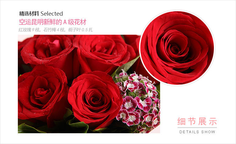 卡罗拉红玫瑰9枝,石竹梅4枝(石竹梅缺货则用粉色满天星或红色腊梅代替),栀子叶5枝