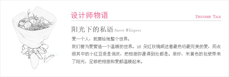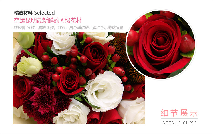红玫瑰16枝,猫眼3枝,红豆、白色洋桔梗、紫红色小菊花适量至花束饱满(如当地红豆缺货,用相思梅等其他寓意相近配材替代。)
