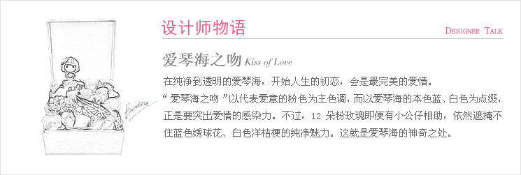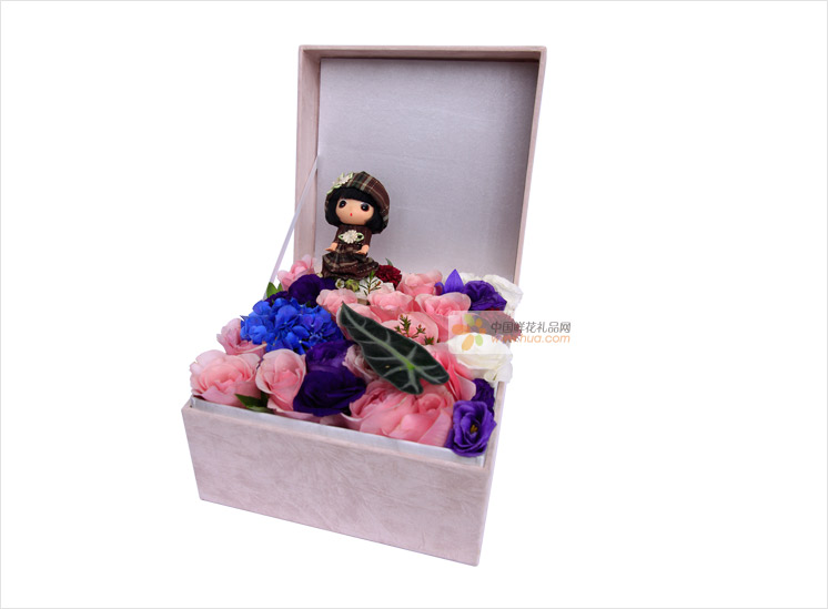 粉玫瑰12枝,深蓝色绣球1枝,白色洋桔梗、紫红色小菊花少许(可用其它紫红色的小型花材替代),小公仔一个