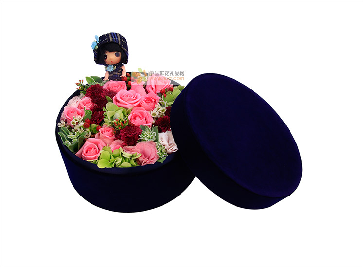 玛丽亚粉玫瑰12枝,绿色绣球1枝,粉色洋桔梗、叶上花少许,小公仔一个