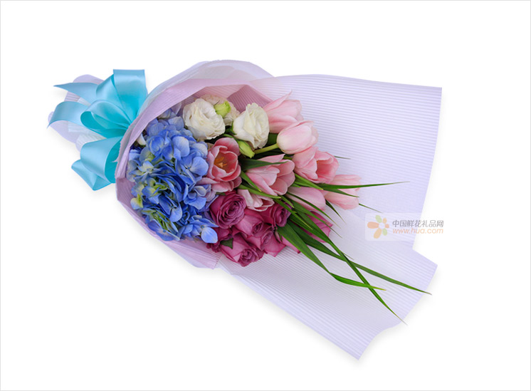 粉色郁金香9枝,紫色玫瑰11枝,浅蓝色绣球1枝,白色洋桔梗适量,条状叶材适量