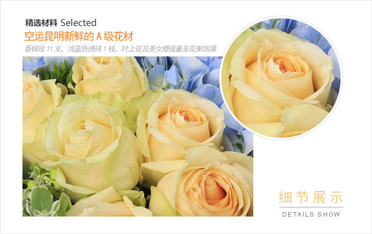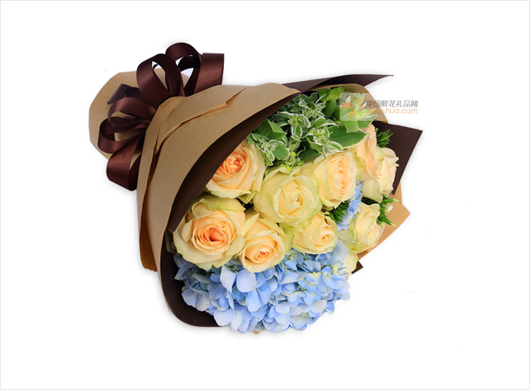 香槟玫瑰11支,浅蓝色绣球1枝,叶上花5枝 ,美女樱3枝