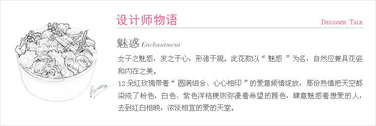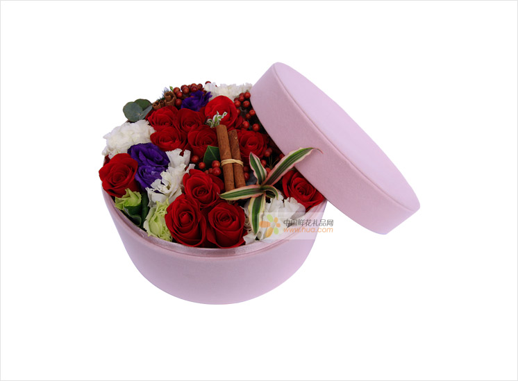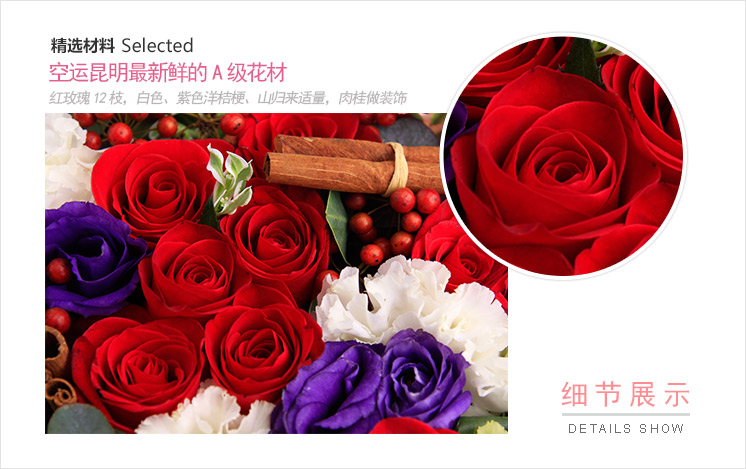 红玫瑰12枝,白色、紫色洋桔梗、红豆、山归来适量至礼盒丰满,肉桂做装饰