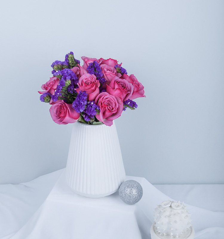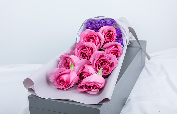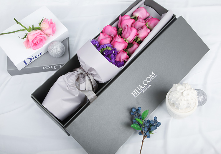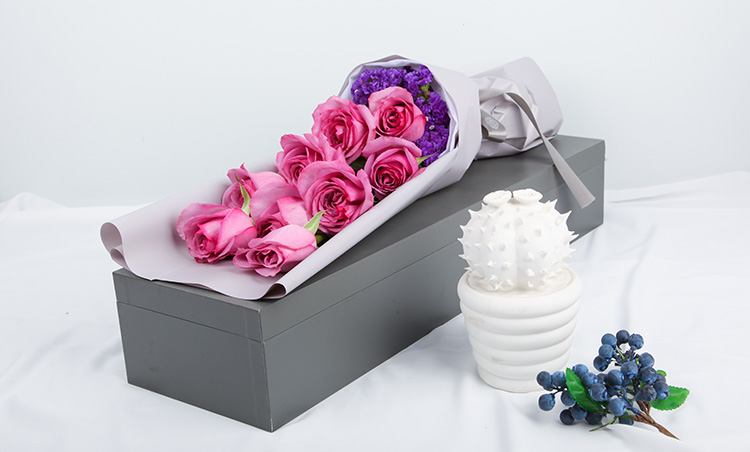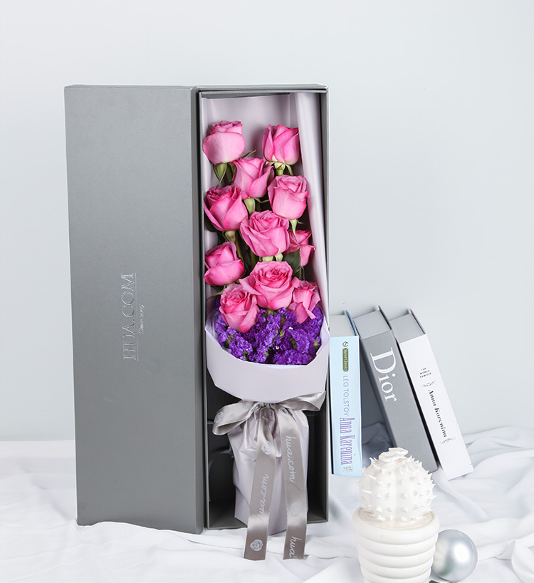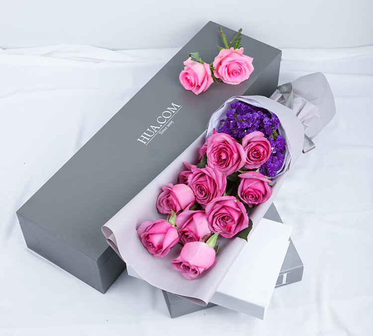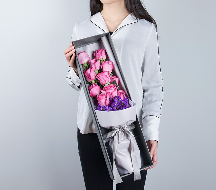 高档礼盒装鲜花:冷美人玫瑰11枝,紫色勿忘我10枝