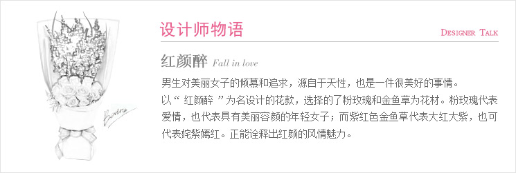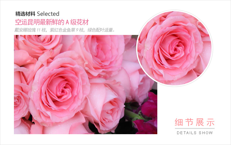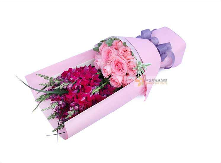 11枝戴安娜玫瑰,紫红色金鱼草9枝,绿色配叶适量。