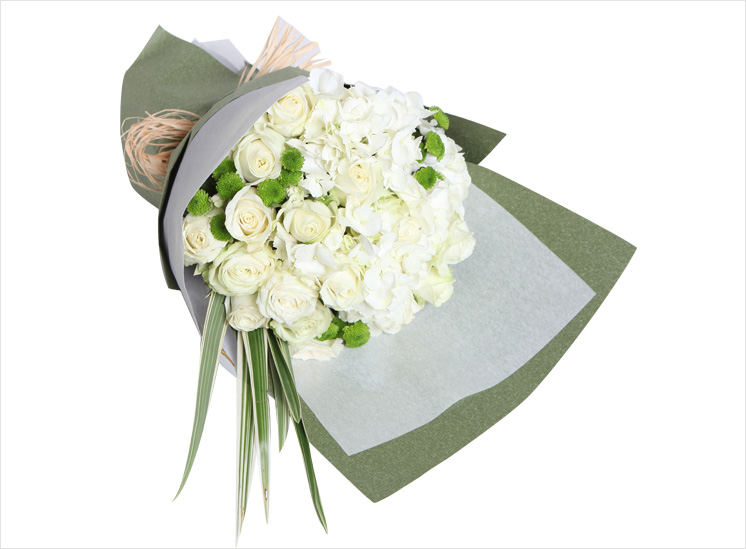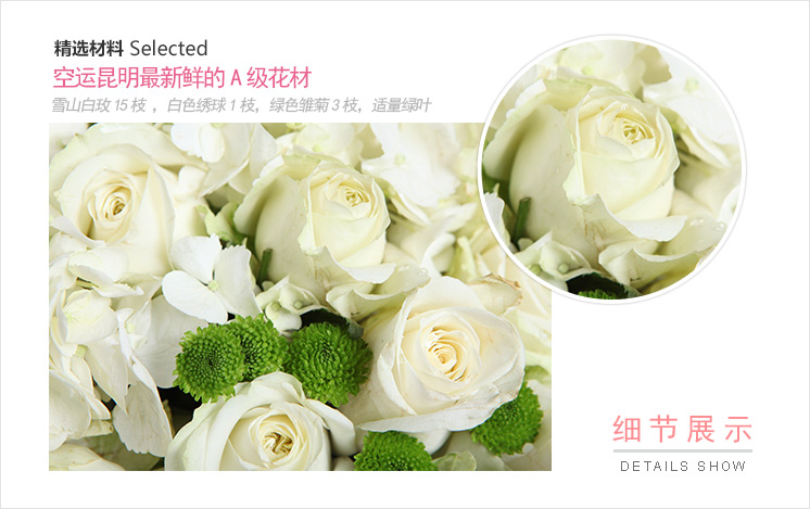 雪山白玫瑰15枝 ,白色绣球1枝,绿色雏菊3枝,适量绿叶