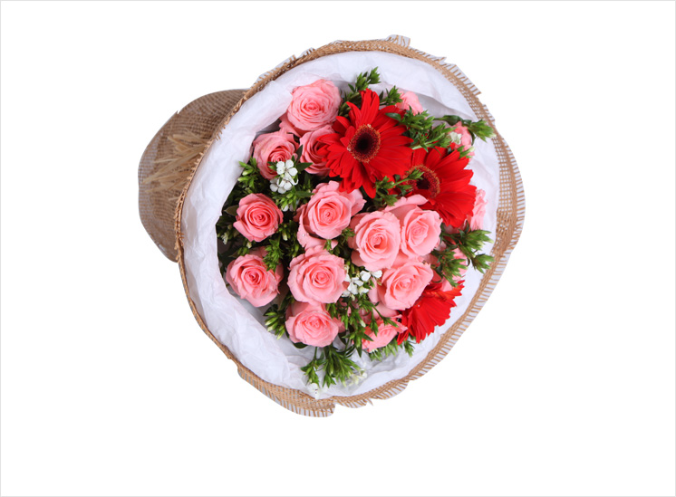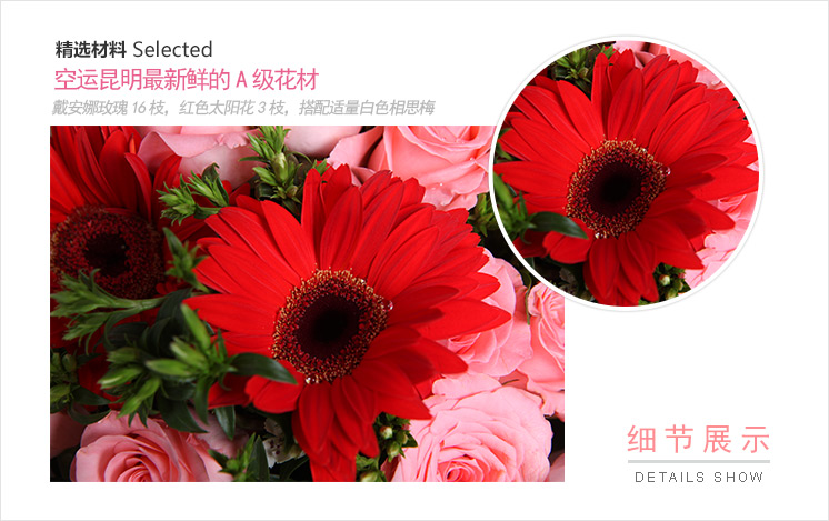 戴安娜粉玫瑰16枝,红色太阳花3枝,搭配适量白色相思梅