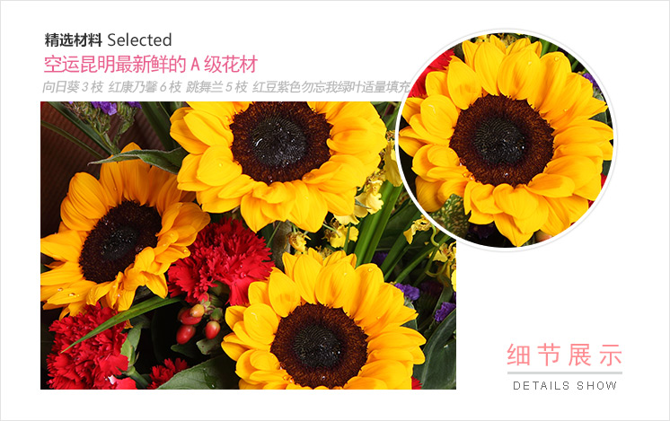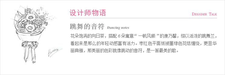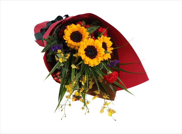 向日葵3枝,红康乃馨6枝,跳舞兰5枝,红豆、紫色勿忘我、绿叶适量填充