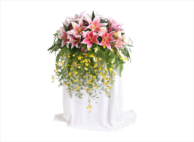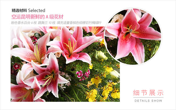 粉色香水百合6枝,跳舞兰10枝,填充适量香槟色桔梗石竹梅绿叶