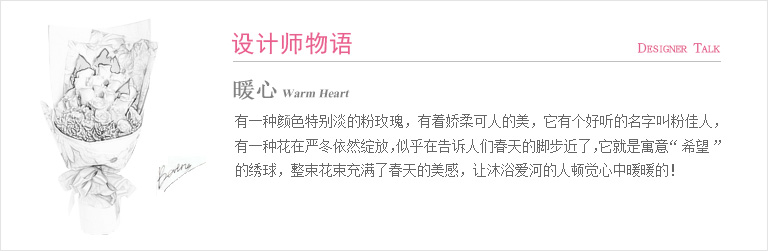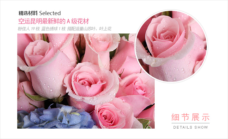 精品玫瑰系列:粉佳人粉玫瑰19枝,蓝色绣球1枝,搭配适量山苏叶、叶上花