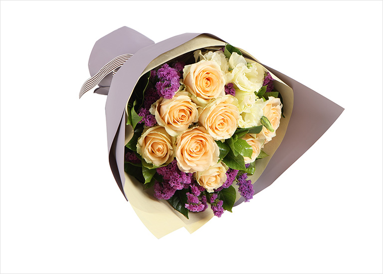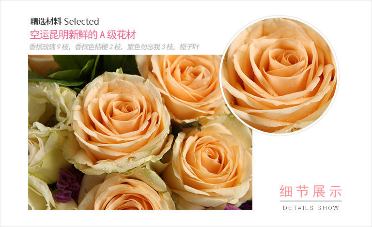 香槟玫瑰9枝,香槟色桔梗2枝(3头以上/支),紫色勿忘我3枝,栀子叶5枝