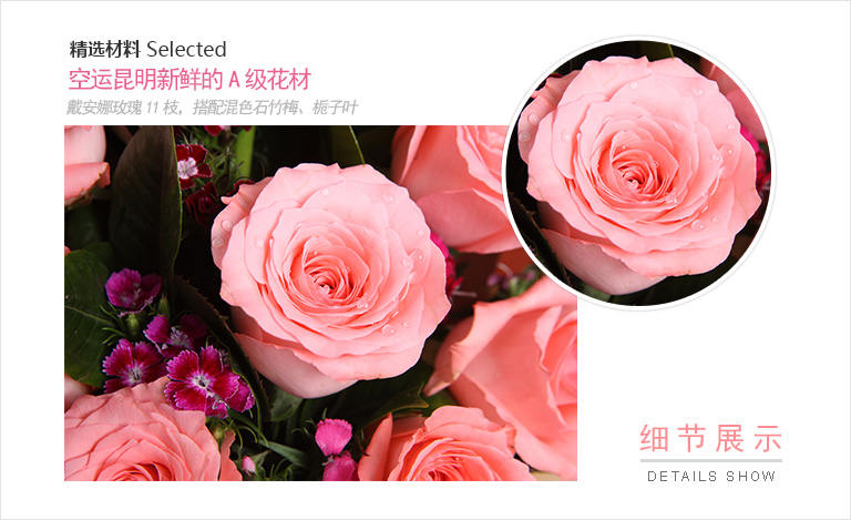 戴安娜粉玫瑰11枝,混色石竹梅10枝、栀子叶5枝