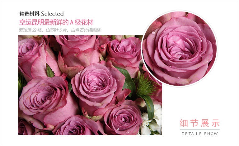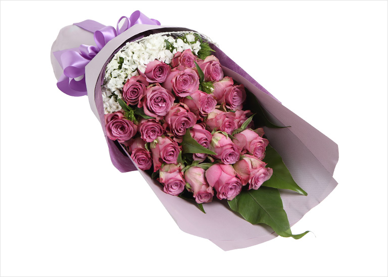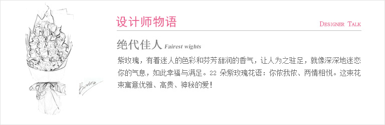 紫玫瑰22枝,山苏叶5片,白色石竹梅围绕