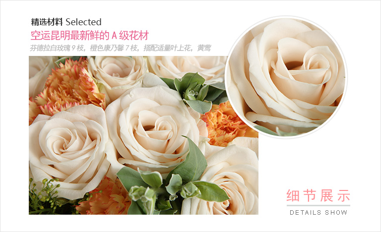 芬德拉白玫瑰9枝,橙色康乃馨7枝