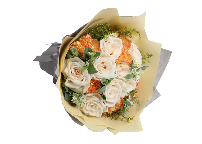 芬德拉白玫瑰9枝,橙色康乃馨7枝,搭配适量叶上花,黄莺