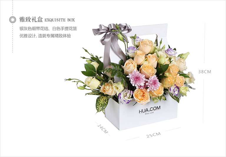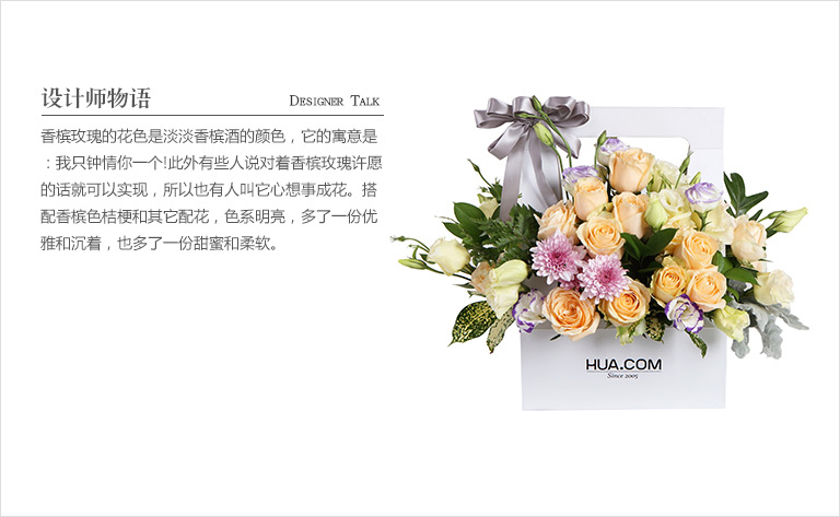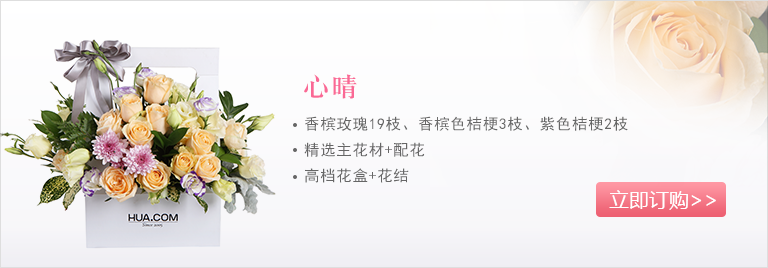 香槟玫瑰19枝、香槟色桔梗3枝、紫色桔梗2枝,搭配适量紫色小菊、银叶菊、 绿叶