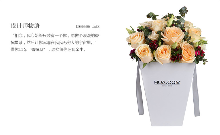 香槟玫瑰11枝,香槟色桔梗3枝,石竹梅5枝,适量尤加利
