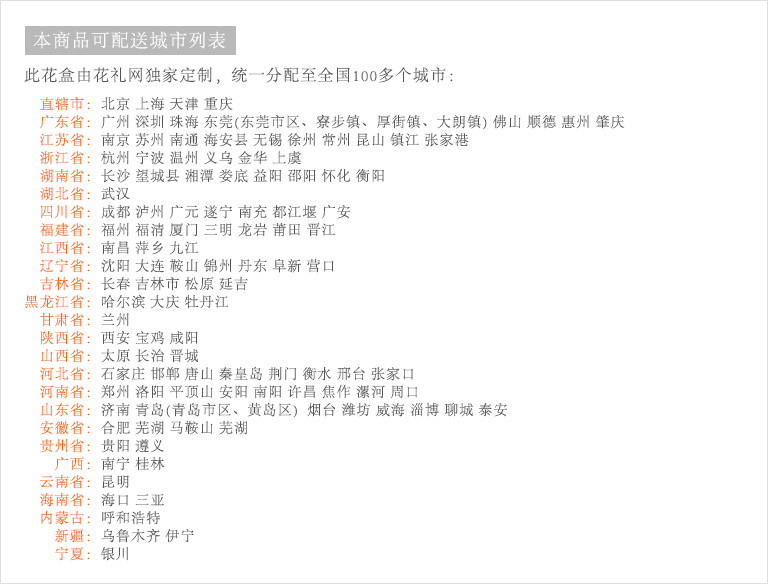 限送100多个主要城市的市区及近郊:北京,上海,深圳,广州,成都,武汉,南京,杭州,苏州,天津,西安,长沙,东莞,厦门,佛山,沈阳,合肥,重庆,大连,郑州,青岛,太原,无锡,石家庄,济南,宁波,哈尔滨,乌鲁木齐,贵阳,昆明,福州,长春,南昌,兰州,珠海,南宁,中山,常州,金华,邯郸,泉州,海口,嘉兴,南通,呼和浩特,廊坊,唐山,温州,徐州,绵阳,烟台,襄阳,保定,潍坊,镇江,衡阳,包头,赣州,扬州,清远,荆州,莆田,汉中,洛阳,湛江,九江,鞍山,大庆,秦皇岛,张家口,桂林,吉林,淄博,蚌埠,柳州,遵义,邢台,宜春,漳州,三亚,宜宾,东营,临沂,德州,开封,大同,龙岩,齐齐哈尔,连云港,新乡,黄冈,焦作,十堰,驻马店,信阳,牡丹江,黄石,宝鸡,丹东,阜阳,北海,聊城,锦州,许昌,内江,萍乡,安庆,承德,商丘,盘锦,乐山,沧州,河源,营口,平顶山,临汾,韶关,日照,新余,晋城,松原,淮北,淮南,晋中,潮州,滨州,自贡,六安,株州,濮阳,常熟,晋江,顺德,江阴,吴江,昆山,义乌,惠阳,银川,温江,燕郊,新都,涿州,南沙,宜兴,即墨,海安县,都江堰,增城,仙桃,菏泽