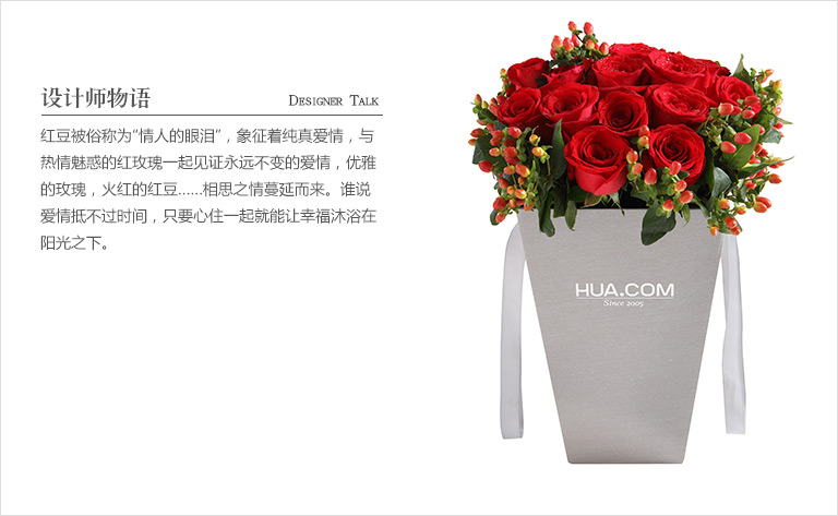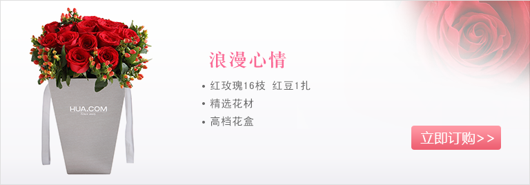 红玫瑰16枝,红豆1扎(如当地红豆缺货,用相思梅等其他寓意相近配材替代。)
