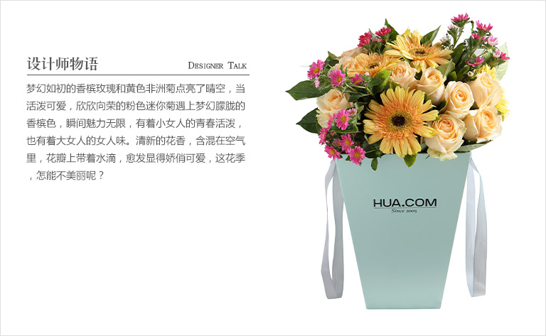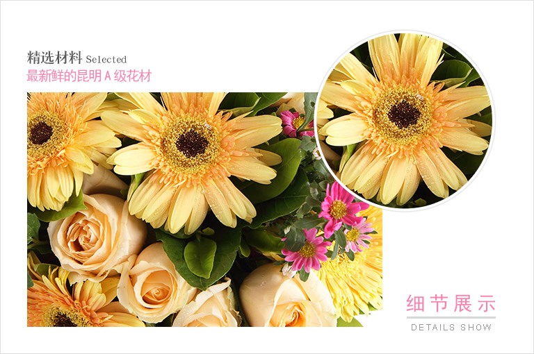 香槟玫瑰11枝,黄色扶郎5枝,搭配适量迷你菊,栀子叶(注:迷你菊为季节性花材,季节性缺货时会用等价的粉色桔梗替代)