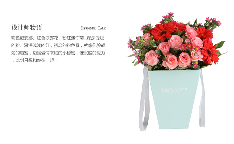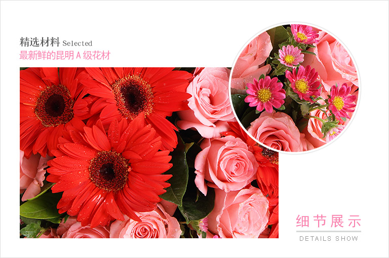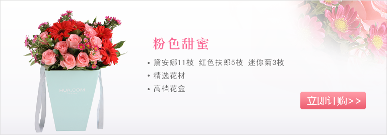 黛安娜粉玫瑰11枝,红色扶郎5枝,迷你菊3枝(迷你菊为季节性花材,如缺货则用等值粉色桔梗替代),栀子叶0.5扎