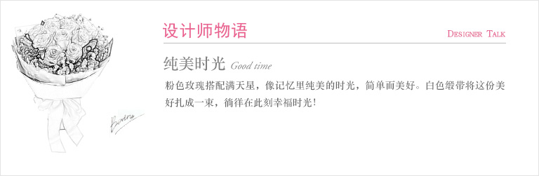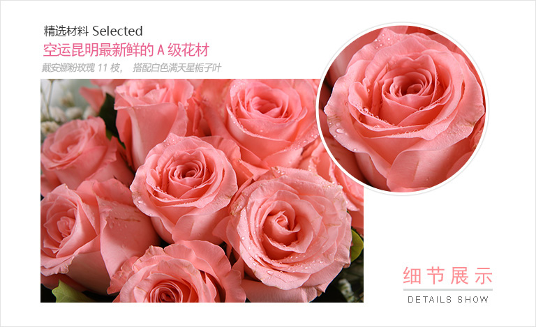 戴安娜粉玫瑰11枝,搭配白色满天星栀子叶