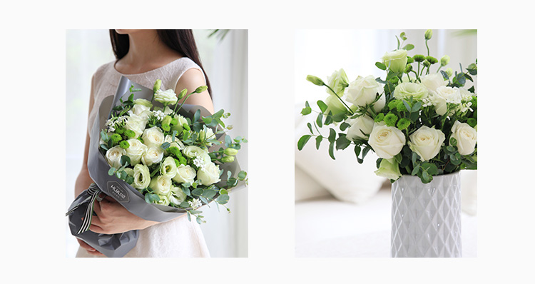 坦尼克玫瑰11枝,绿色桔梗5枝(3头以上/支),小菊3枝,白色石竹梅4枝,尤加利5枝