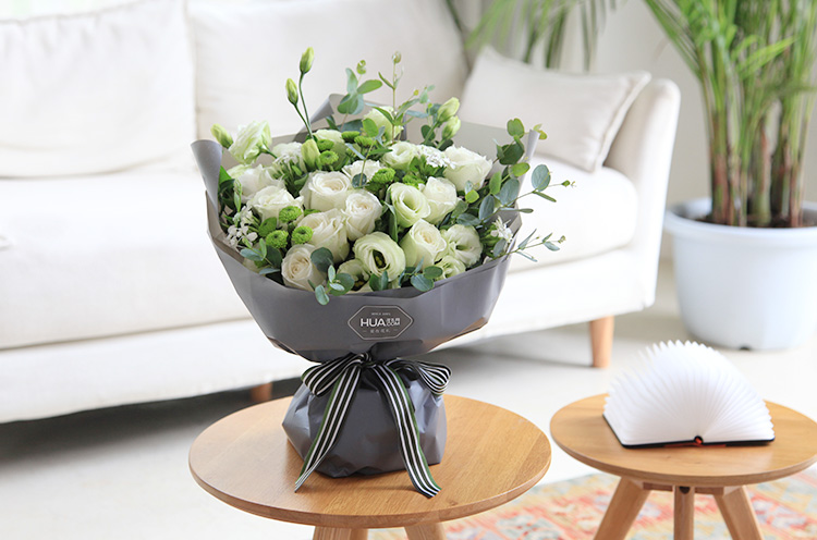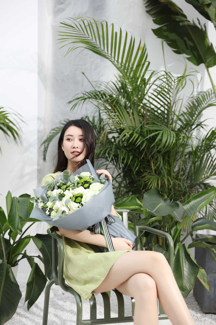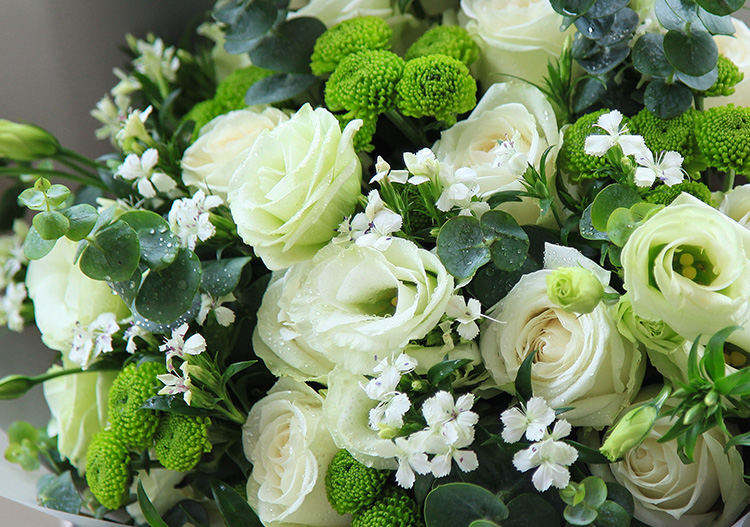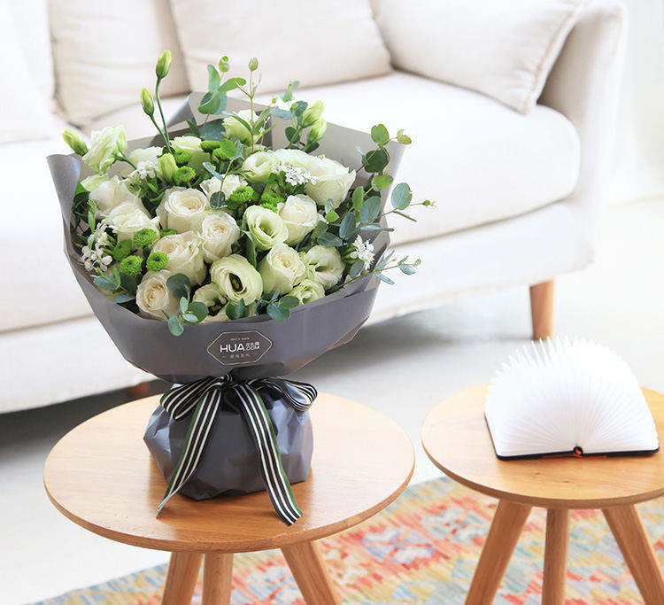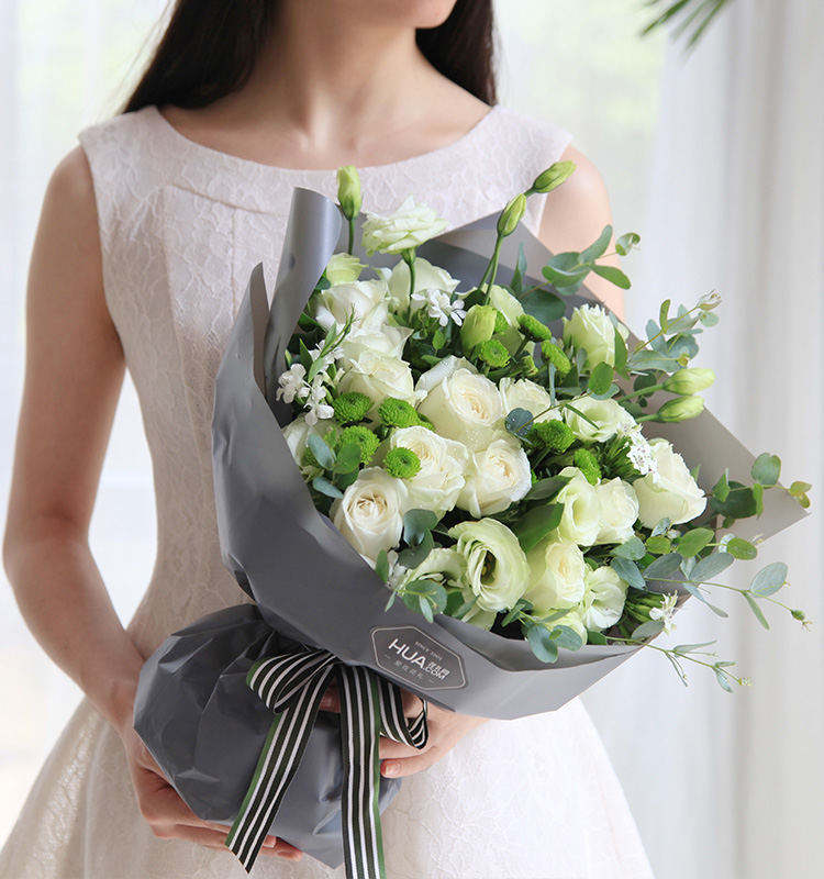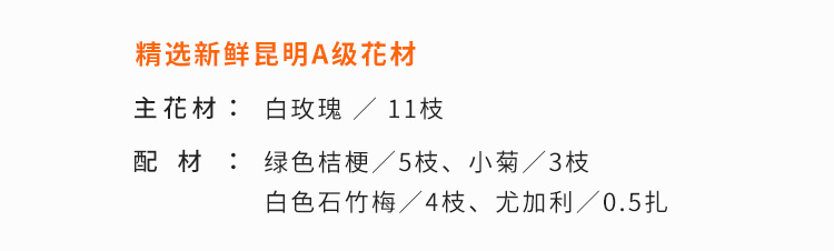 坦尼克玫瑰11枝,绿色桔梗5枝(3头以上/支),小菊3枝,白色石竹梅4枝,尤加利5枝