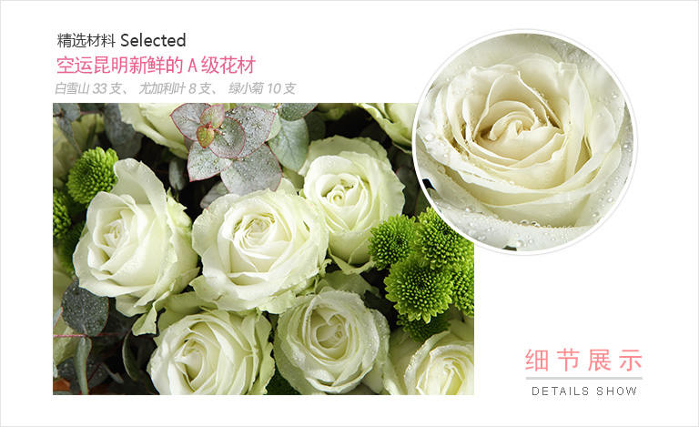 雪山白玫瑰33支、尤加利叶8支、绿小菊10支