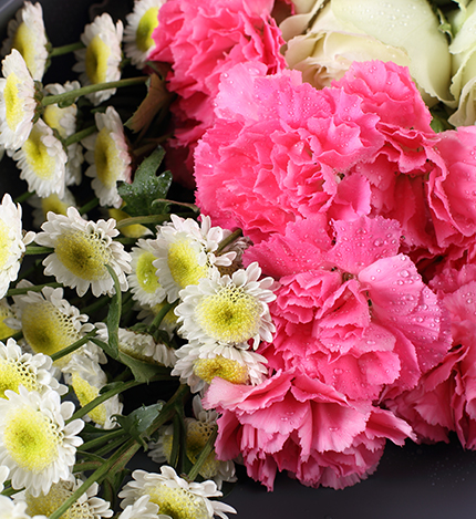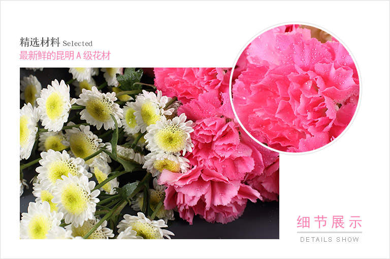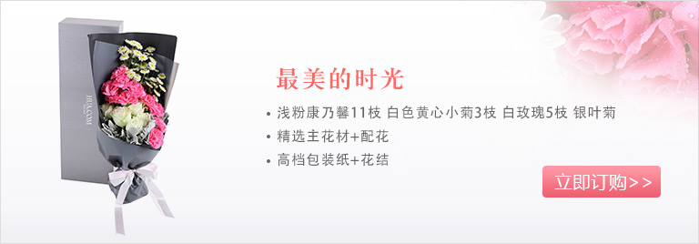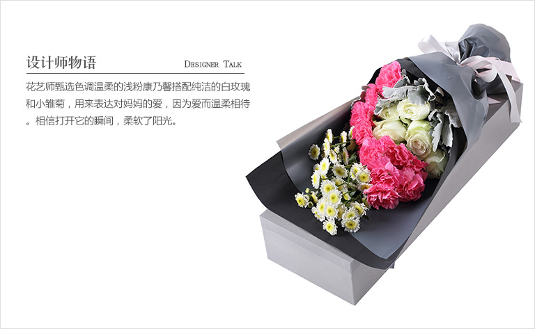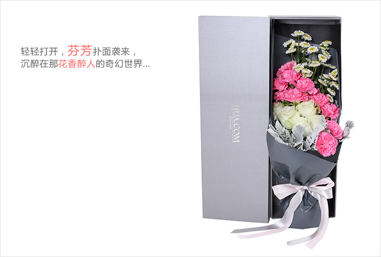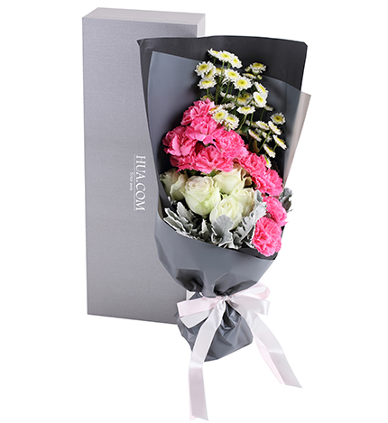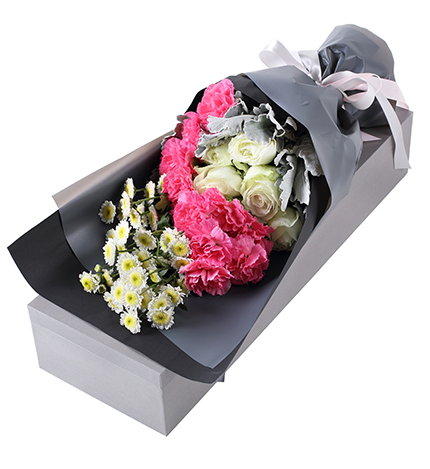 高档礼盒装鲜花:浅粉康乃馨11枝,白色黄心小菊3枝,白玫瑰5枝,银叶菊5枝
