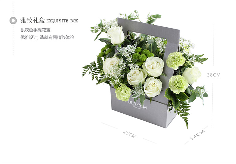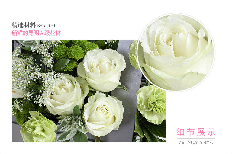 白玫瑰9枝,绿色康乃馨8枝,小绿菊4枝,蕾丝4枝,叶上花5枝,栀子叶3枝,高山羊齿6枝