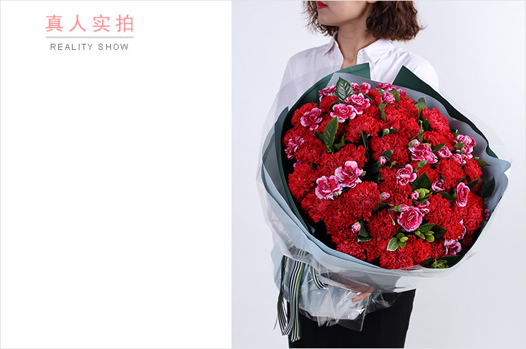 [温暖花束 幸福万年长] 红色康乃馨66枝,白边紫色多头康乃馨15枝,栀子叶2扎