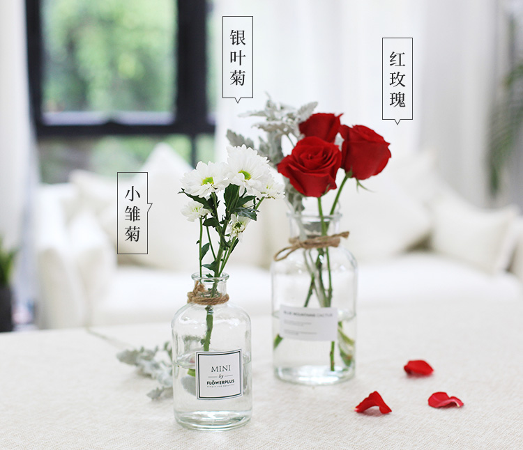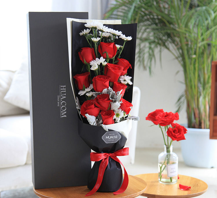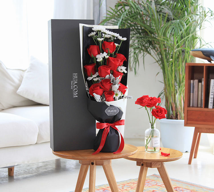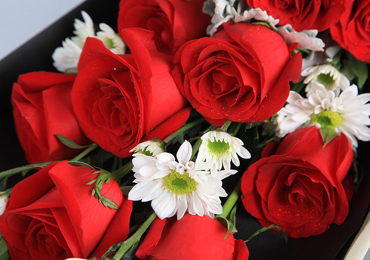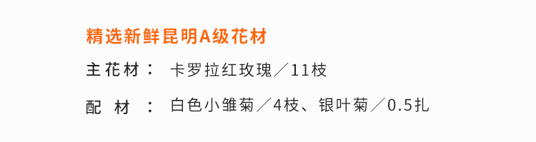 卡罗拉红玫瑰11枝、白色小雏菊4枝、银叶菊0.5扎