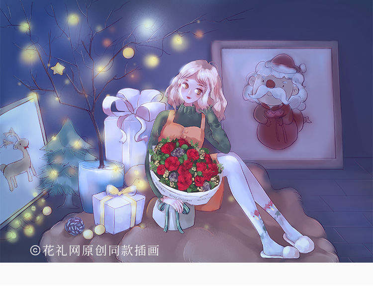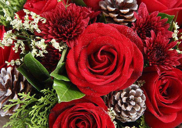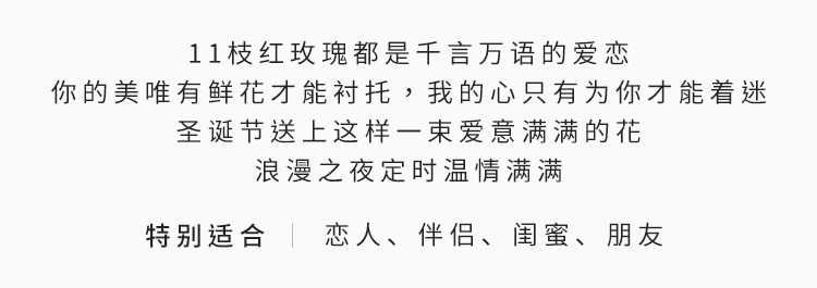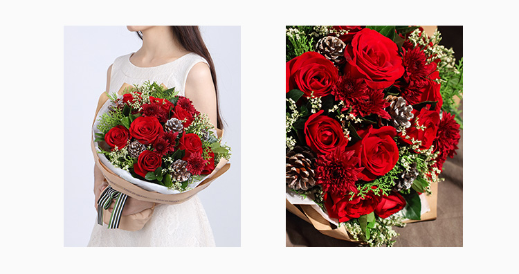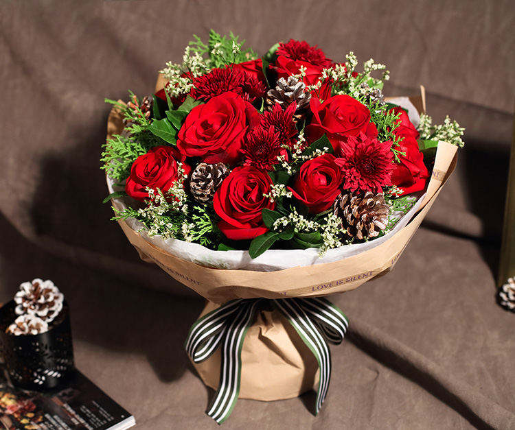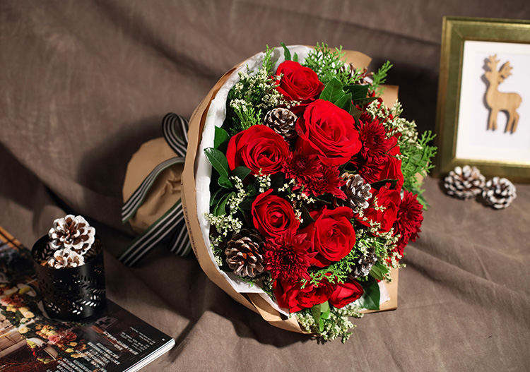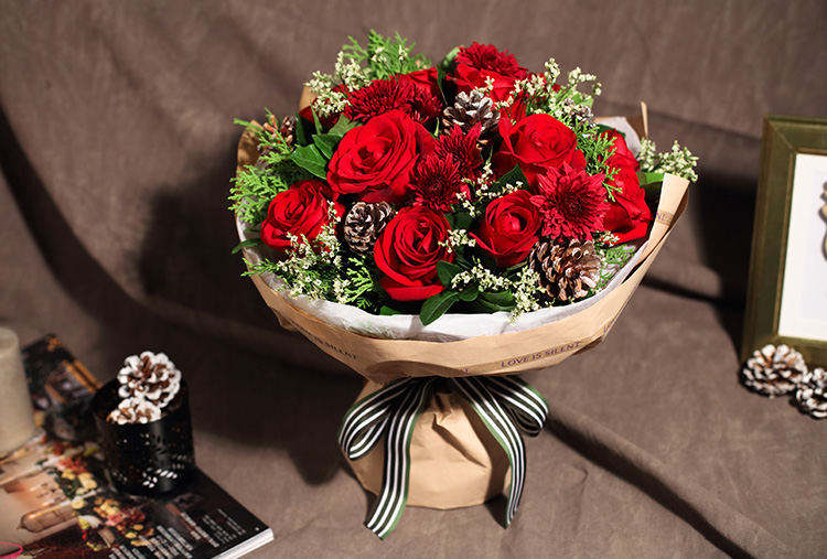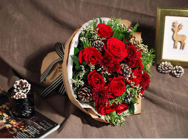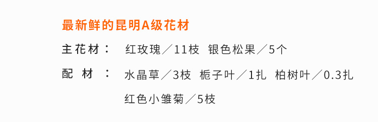 红玫瑰11枝,银色松果5个,红色小雏菊5枝,水晶草3枝,栀子叶1扎,柏树叶0.3扎