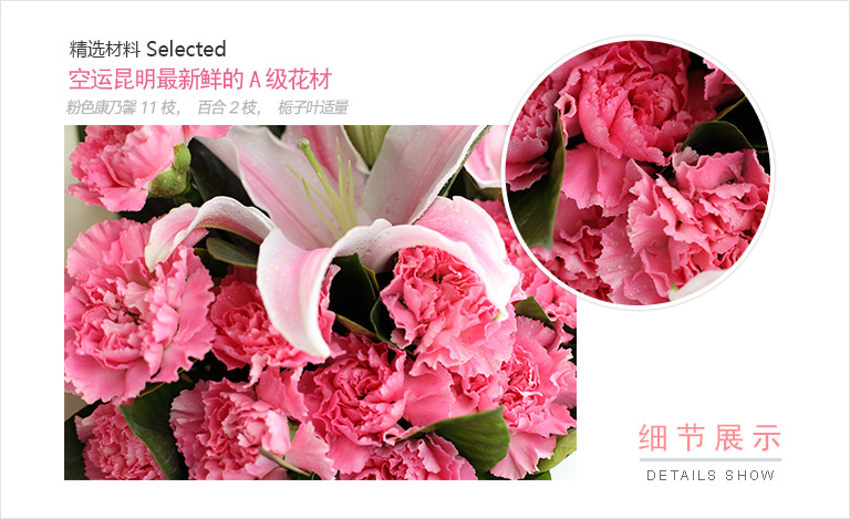 粉色康乃馨11枝,粉色多头香水百合2枝,栀子叶10枝