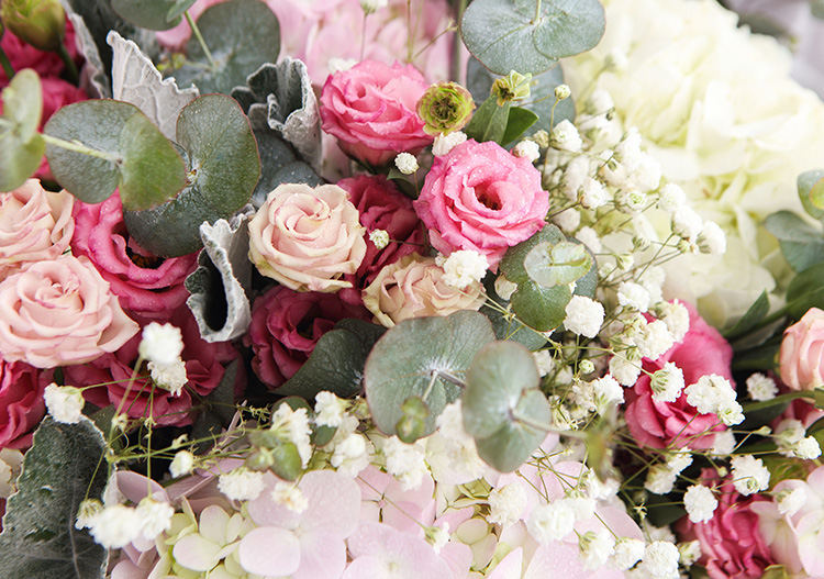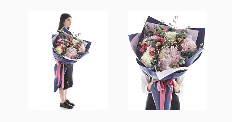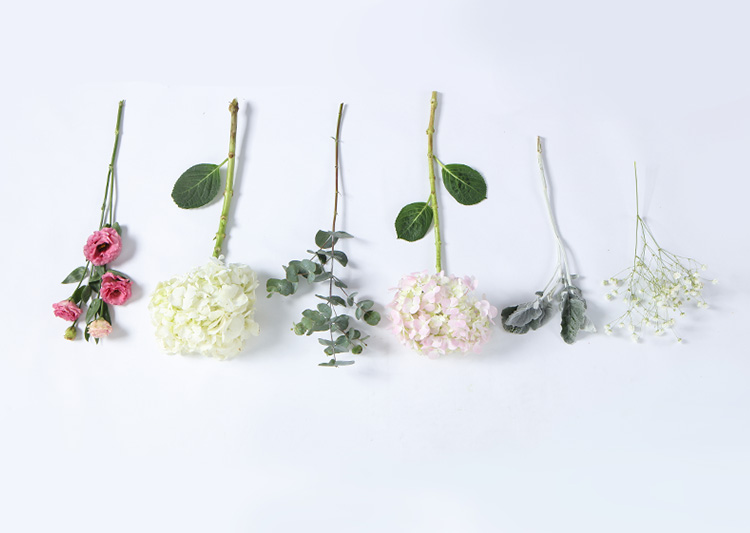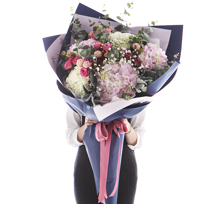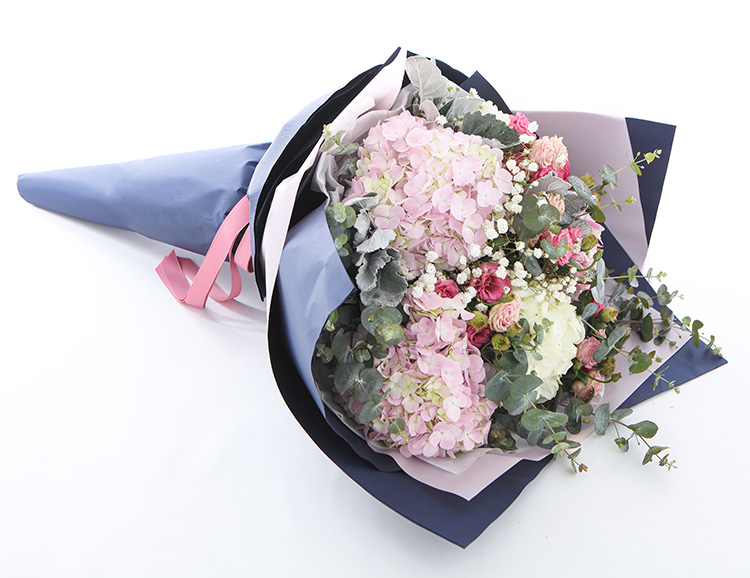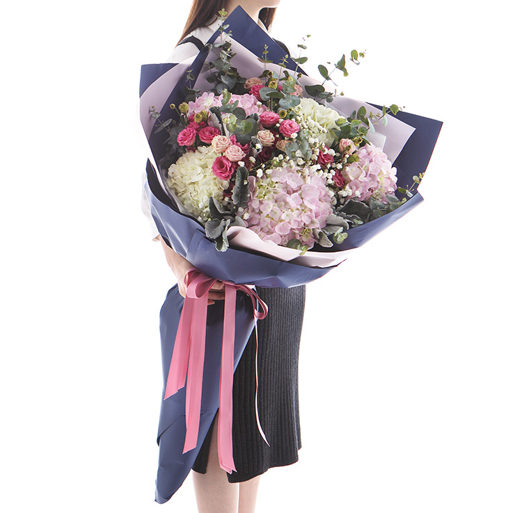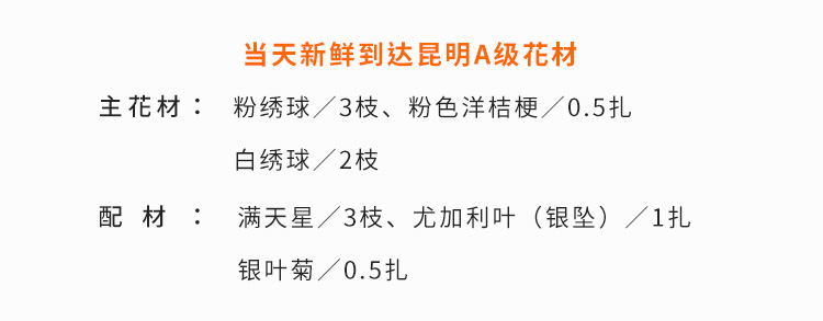 粉绣球3枝、白绣球2枝、粉色洋桔梗0.5扎、满天星3枝、银叶菊5枝、尤加利叶(银坠)10枝,花束长达1.2m~1.3m