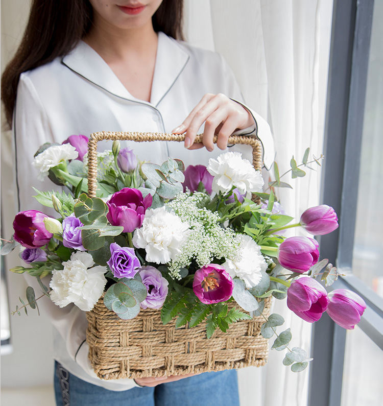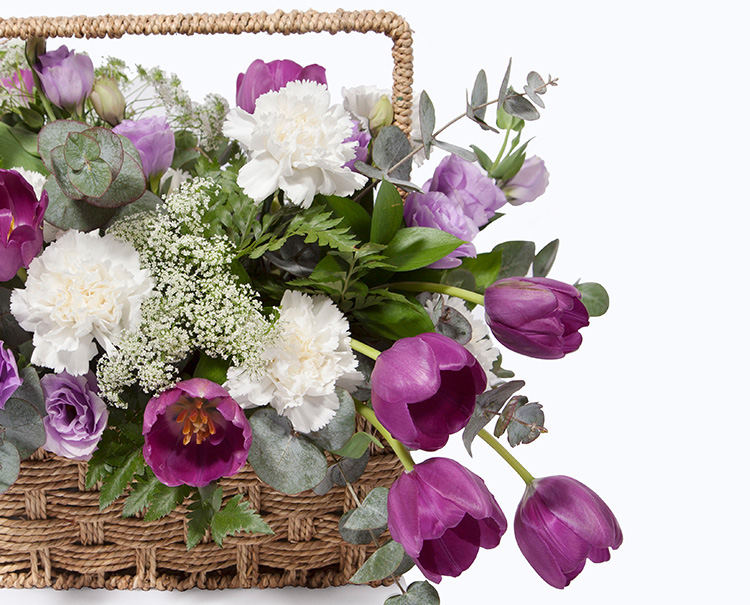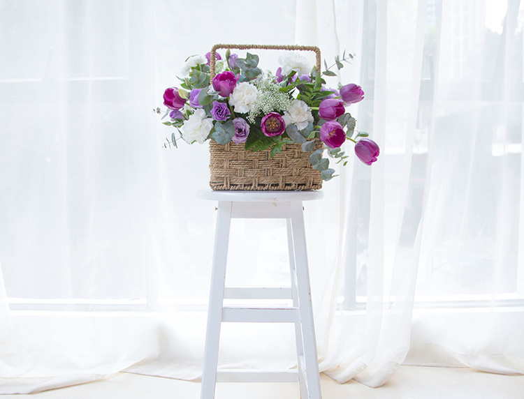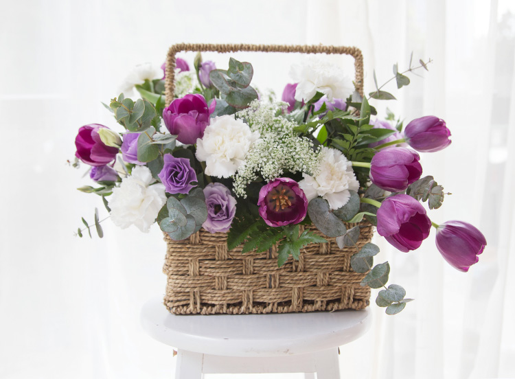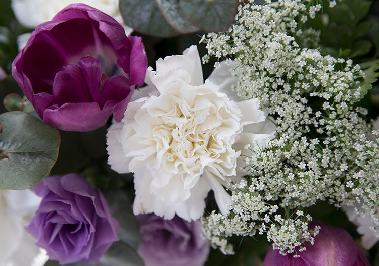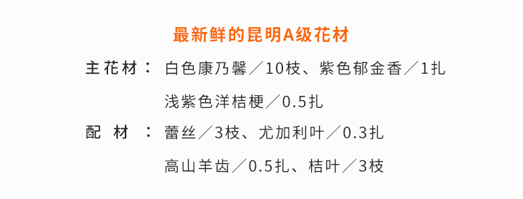 紫色郁金香10枝 (1扎)、白色康乃馨10枝、尤加利叶0.3扎、蕾丝3枝、浅紫色洋桔梗0.5扎、桔叶3枝、高山羊齿0.5扎