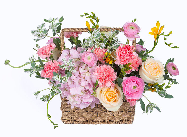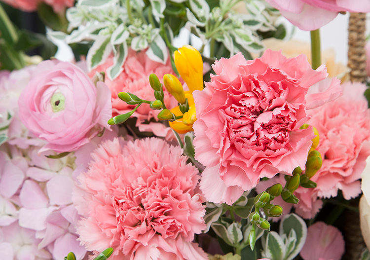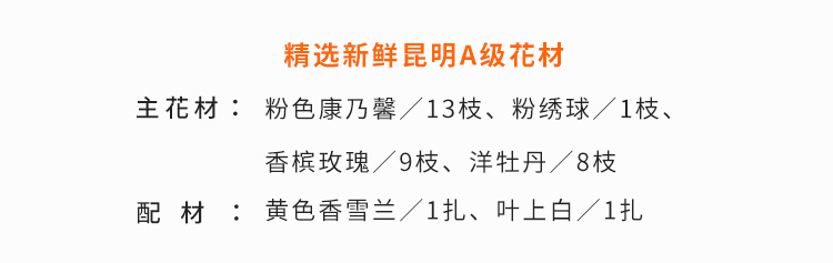 粉色康乃馨13枝、粉绣球1枝、香槟玫瑰9枝、粉色洋牡丹8枝(5月开始洋牡丹过季,用戴安娜粉玫瑰代替)、搭配黄色香雪兰10枝、叶上白10枝