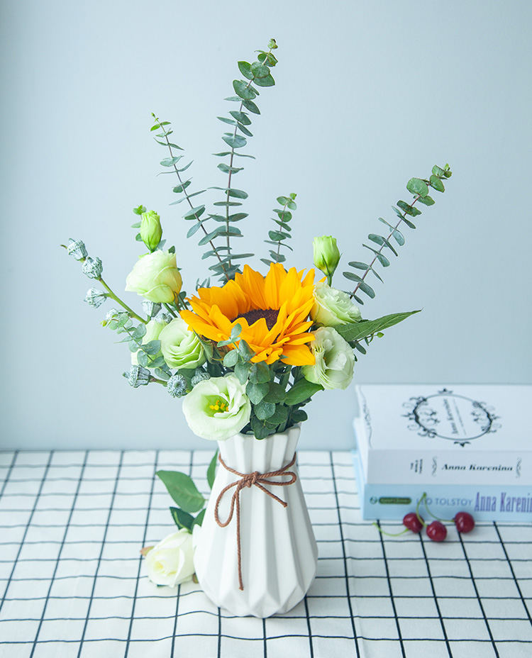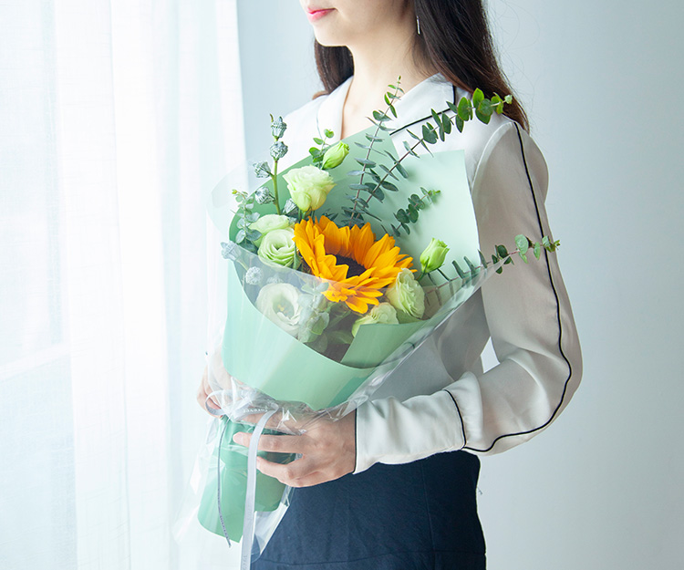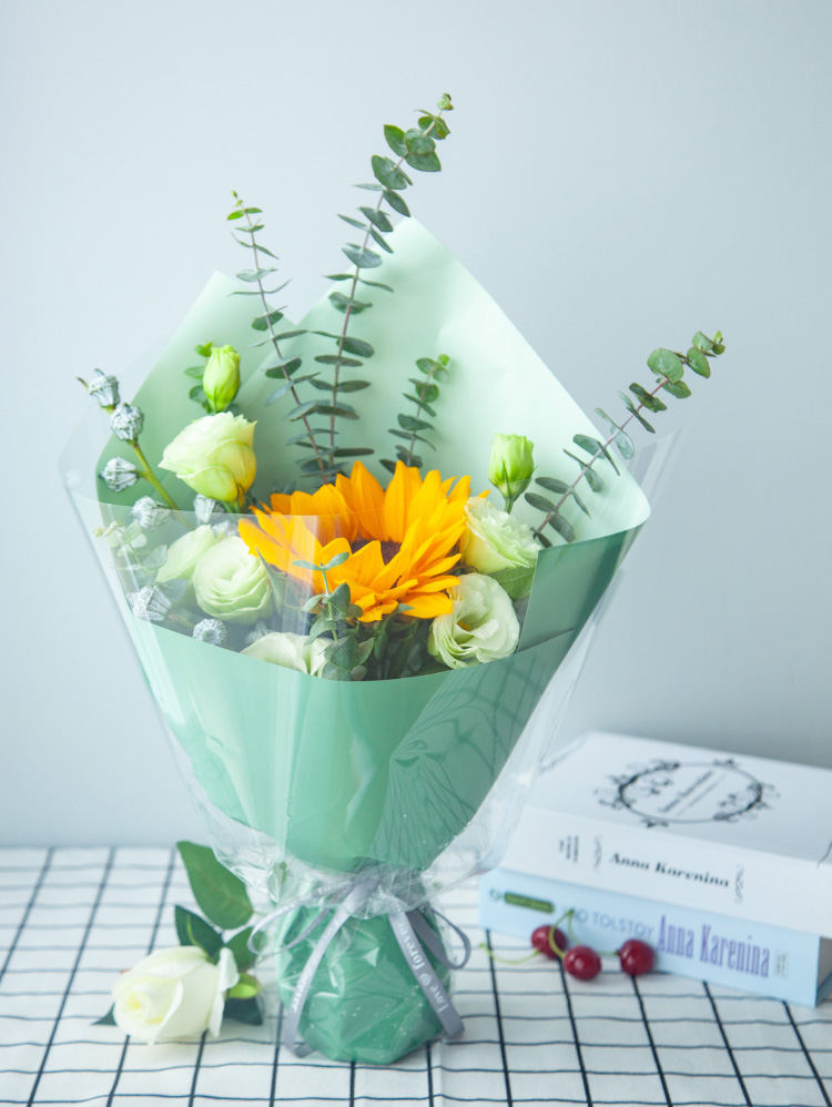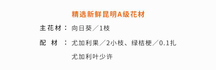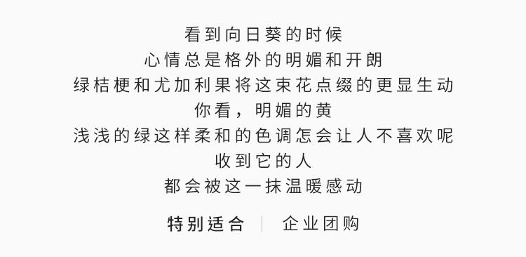 定制款团购鲜花:向日葵1枝,尤加利果2小枝,绿桔梗0.1扎,尤加利叶少许。适合送客户、员工生日关怀、公司周年庆、三八节/教师节等各种节日场合;向日葵款,送男性首选;5束起订,限同一天配送、送同一地址。