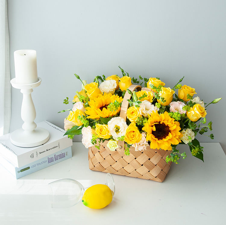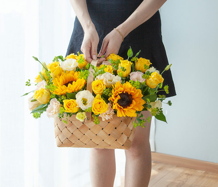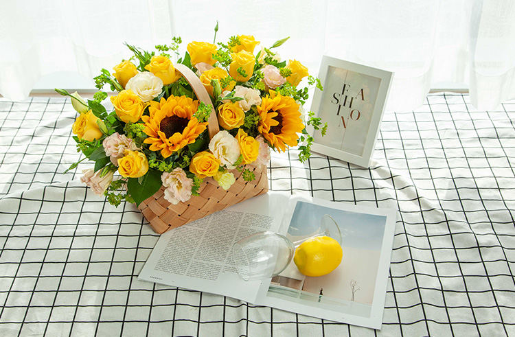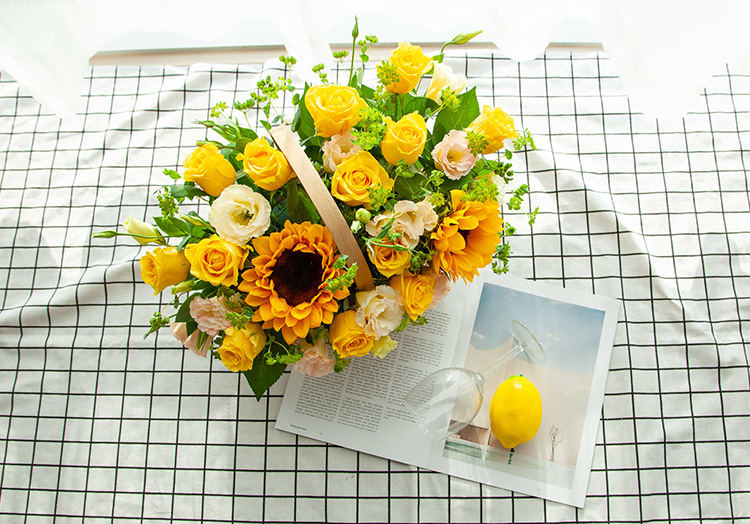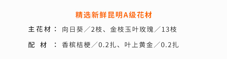 向日葵2枝,金枝玉叶玫瑰13枝,香槟桔梗2枝,叶上黄金2枝