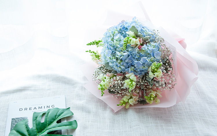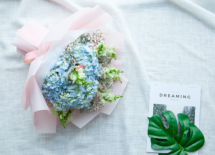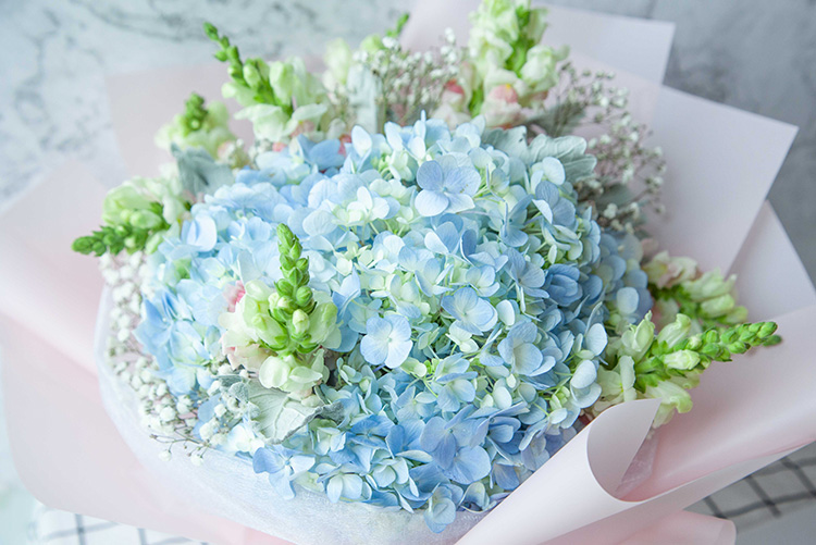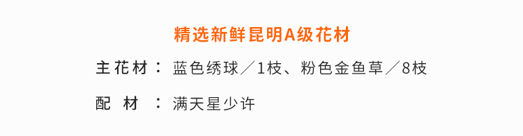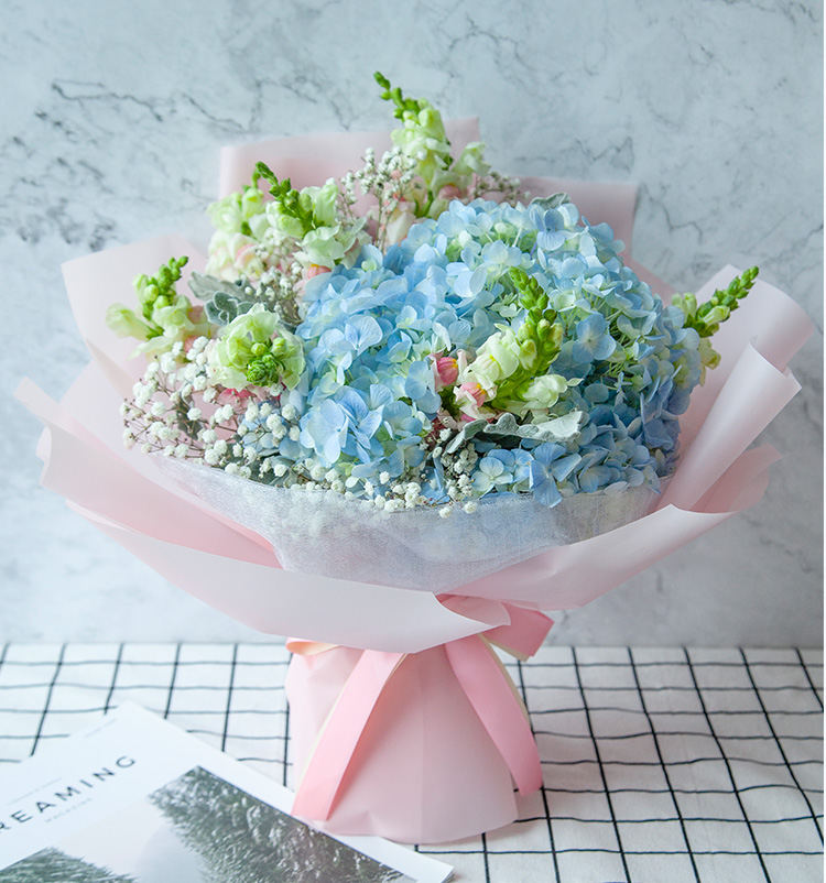 蓝色绣球1枝,粉色金鱼草8枝,满天星少许