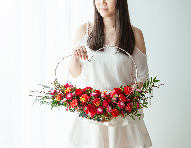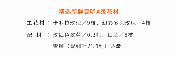 卡罗拉玫瑰9枝,幻彩多头玫瑰4枝,玫红色翠菊3枝,红兰8枝,雪柳(或细叶尤加利)适量