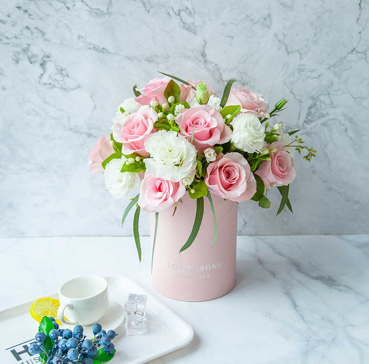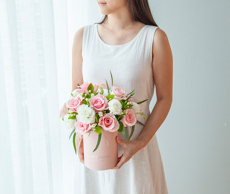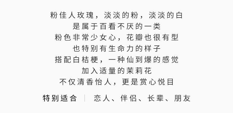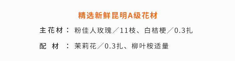 粉佳人玫瑰11枝,白桔梗0.3扎,茉莉花或白色相思梅0.3扎,柳叶桉适量