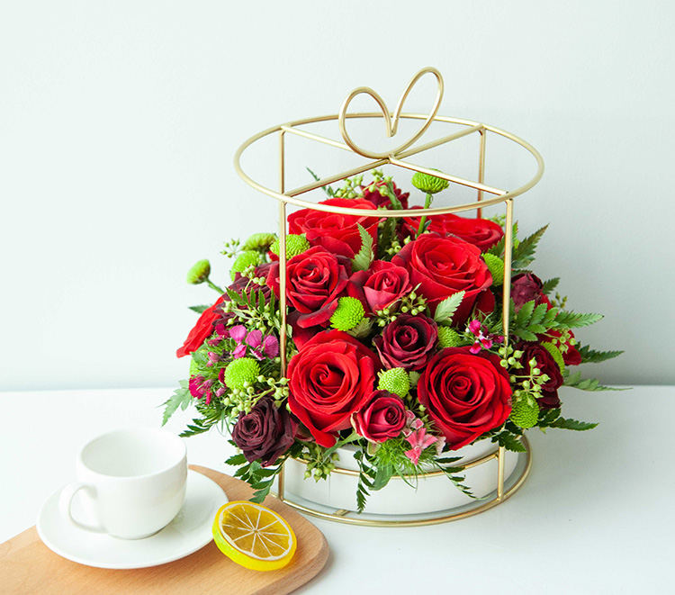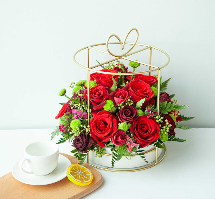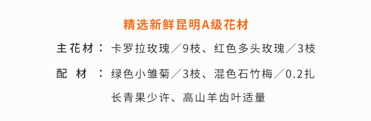 卡罗拉玫瑰9枝,红色多头玫瑰3枝,绿色小雏菊3枝,混色石竹梅2枝,迷你杨果10枝,高山羊齿叶10枝