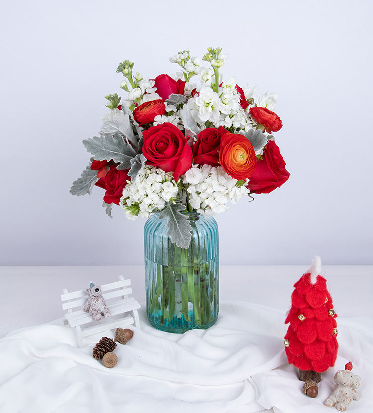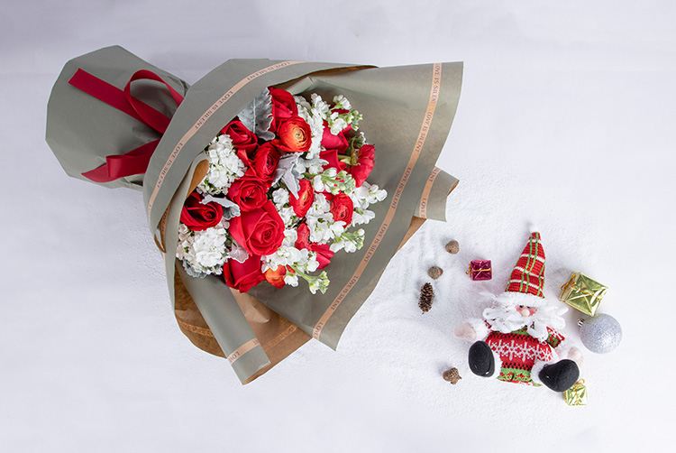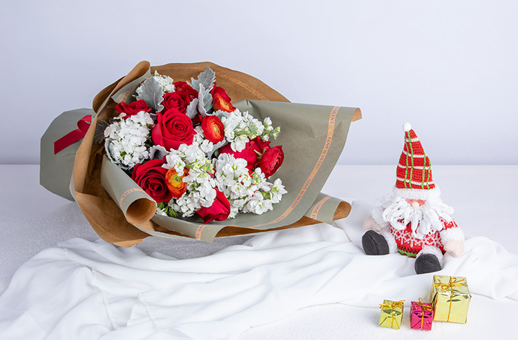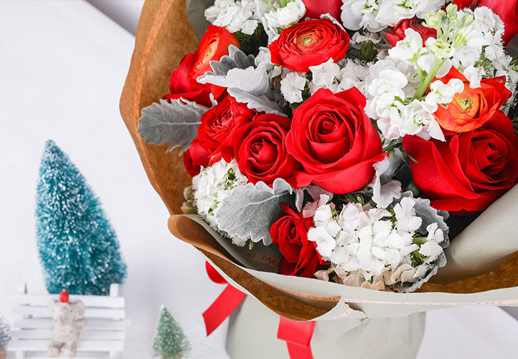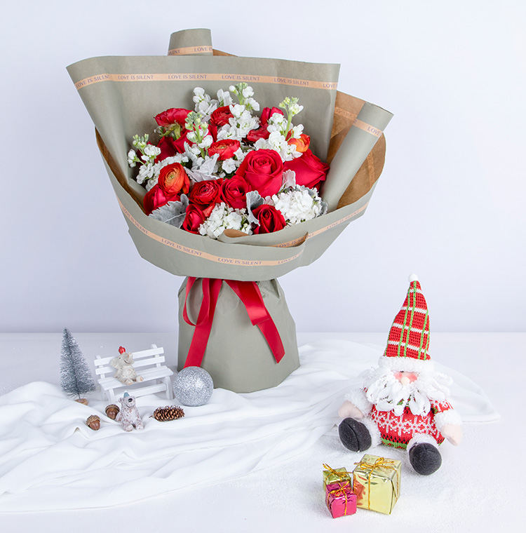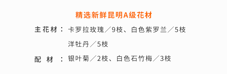 卡罗拉红玫瑰9枝,白色紫罗兰5支,红色洋牡丹5枝,银叶菊2支,白色石竹梅3枝