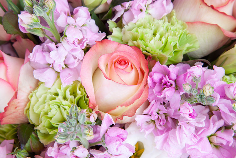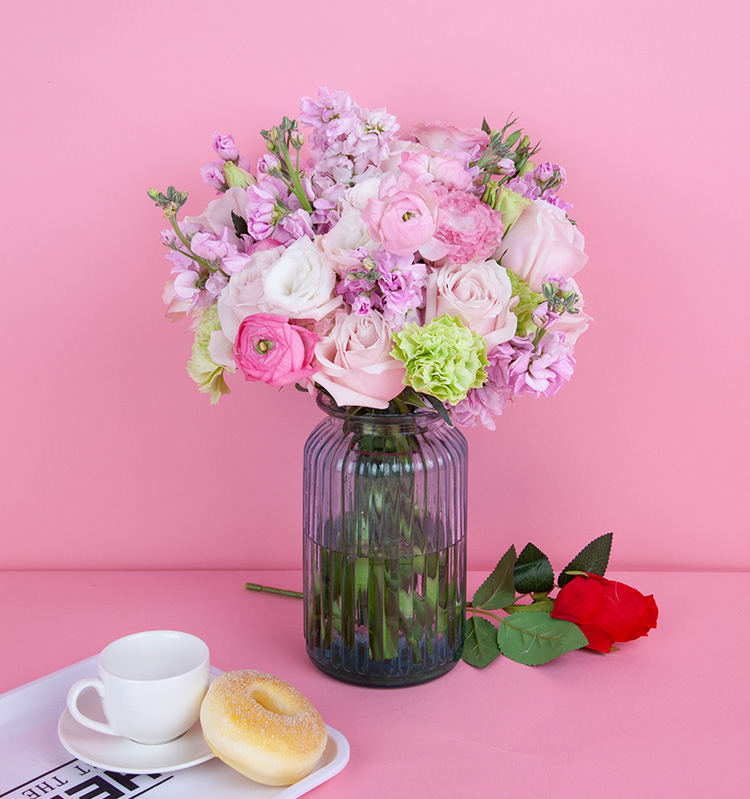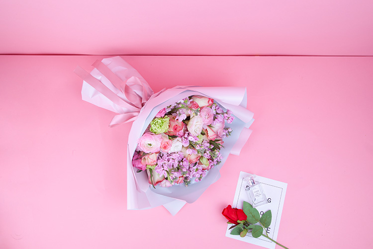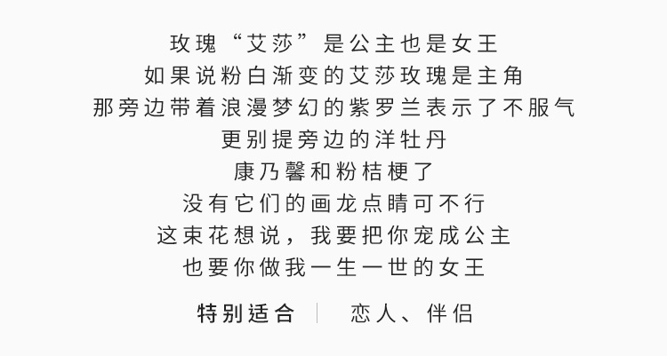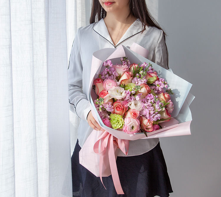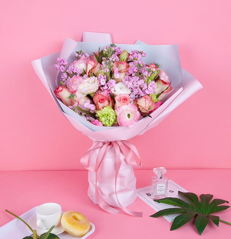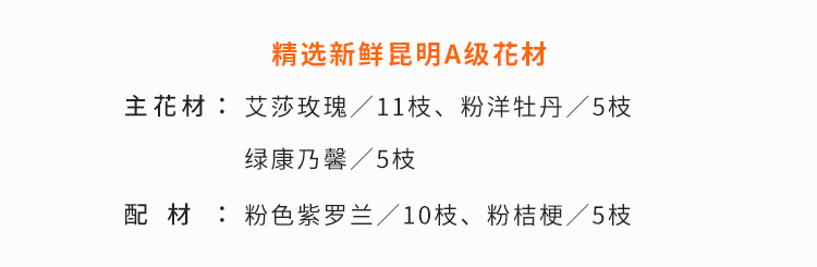 艾莎玫瑰11枝,粉色紫罗兰10枝,粉洋牡丹5枝,绿康乃馨5枝,粉桔梗5枝