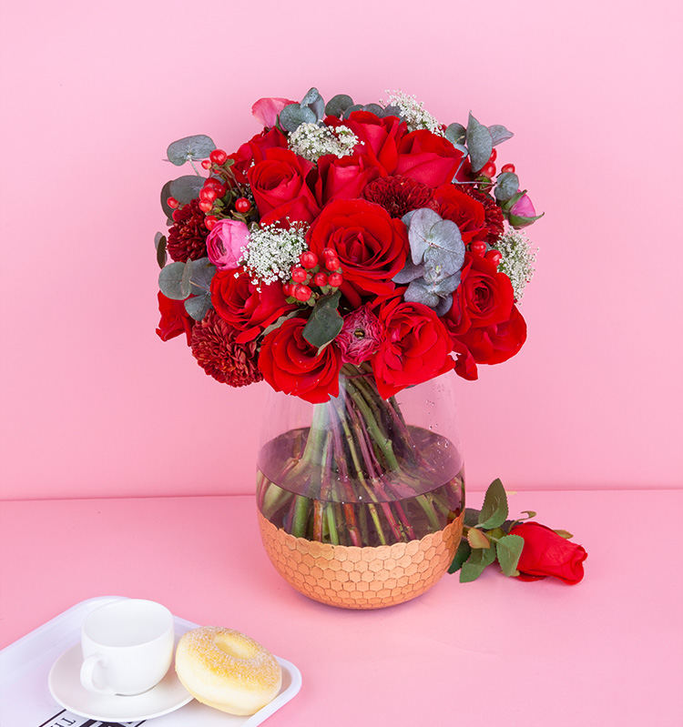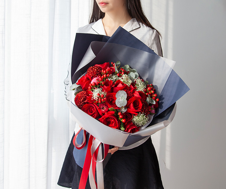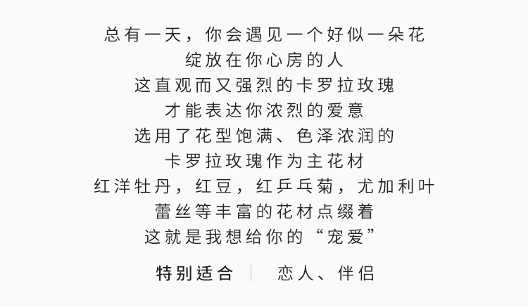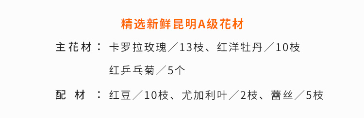 卡罗拉玫瑰13枝,红洋牡丹10枝,红豆10枝,红乒乓菊5个,尤加利叶2枝,蕾丝5枝