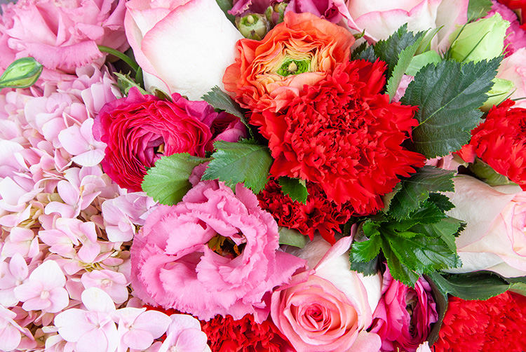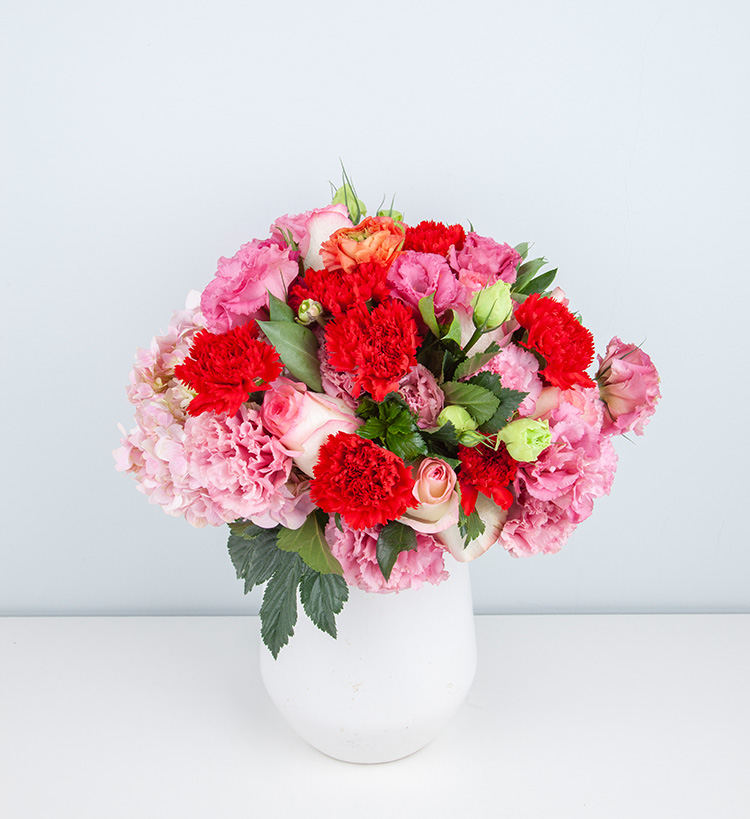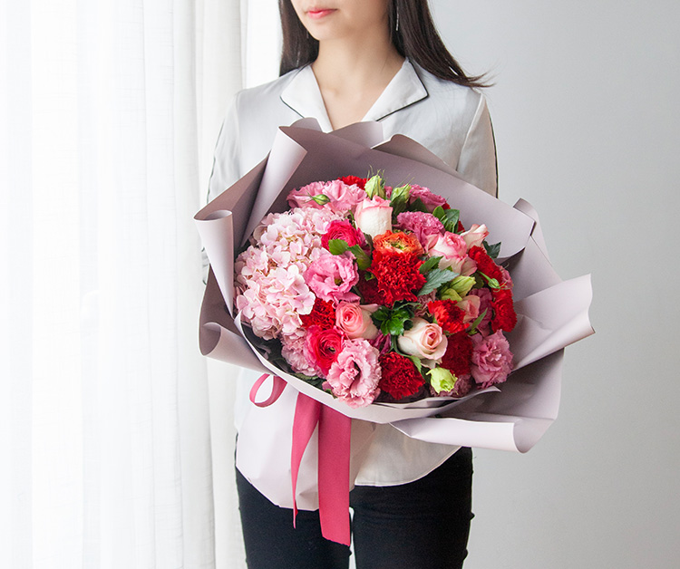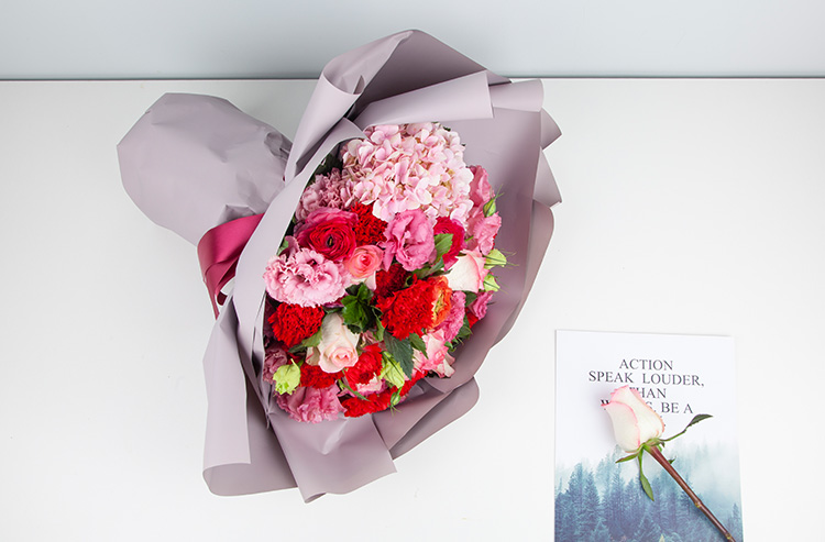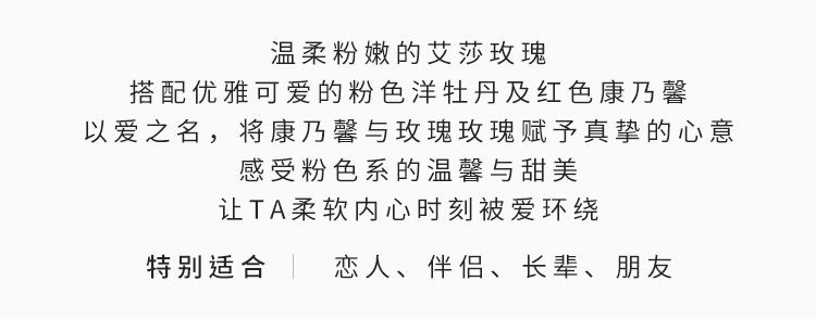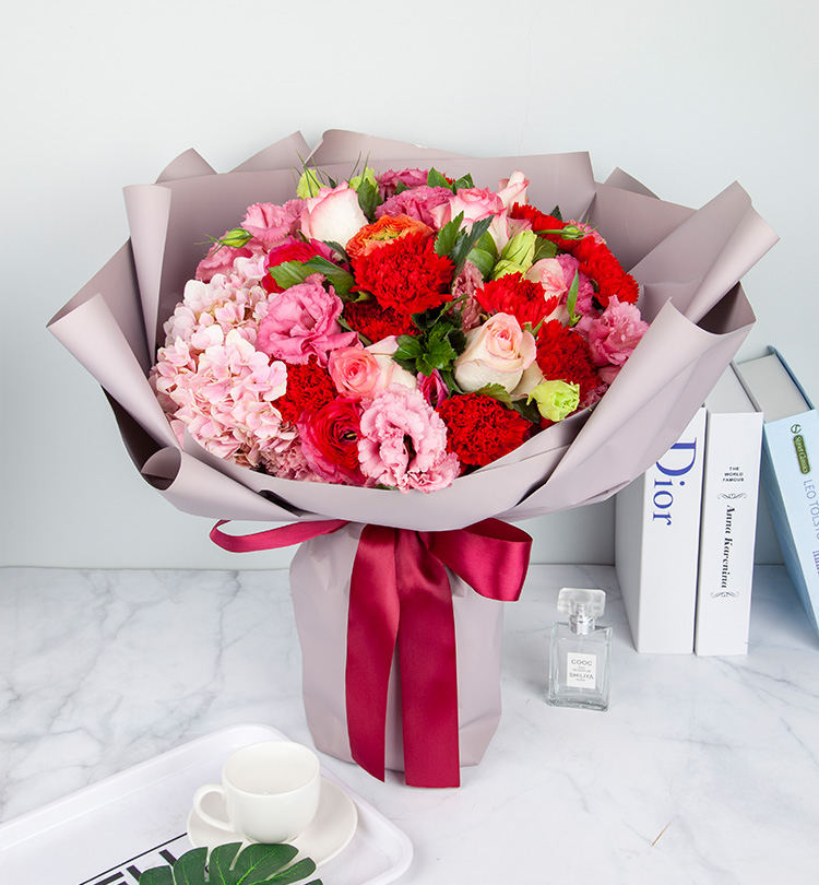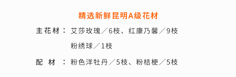艾莎玫瑰6枝,红康乃馨9枝,粉色洋牡丹5枝,粉桔梗5枝,粉绣球1枝
