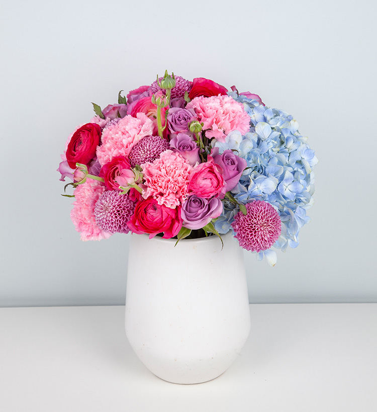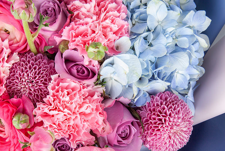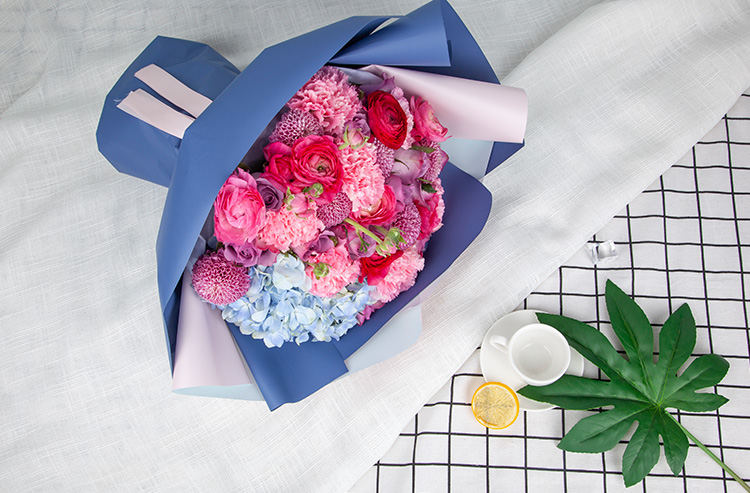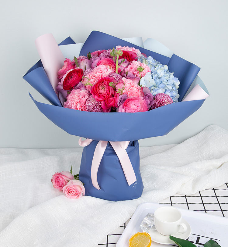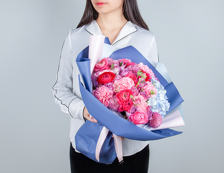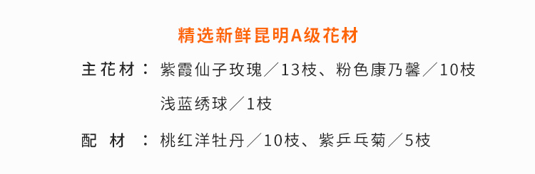 紫霞仙子紫玫瑰13枝,粉色康乃馨10枝,桃红洋牡丹10枝,浅蓝绣球1枝,紫乒乓菊5枝