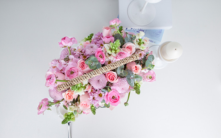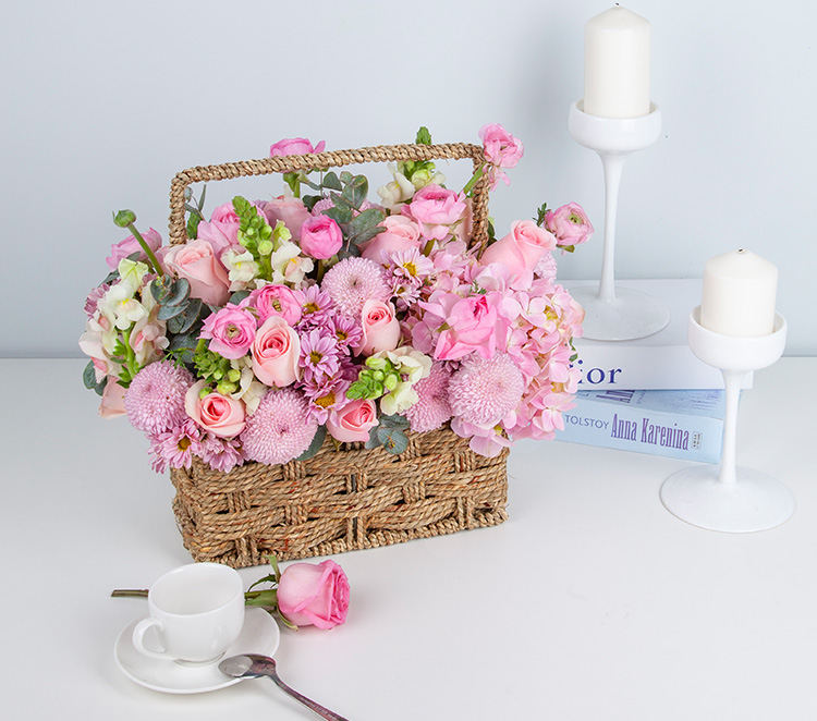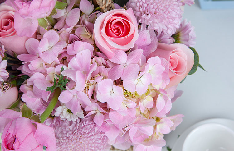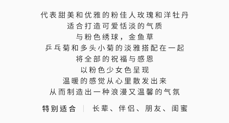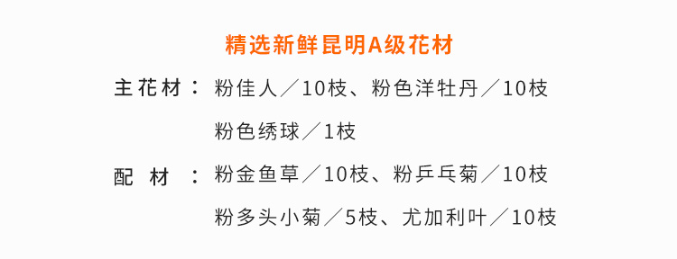 粉佳人玫瑰10枝,粉色洋牡丹10枝(洋牡丹的花期为12-4月,其他季节用粉色多头玫瑰代替),粉色绣球1枝,粉金鱼草10枝,粉乒乓菊10枝,粉多头小菊5枝,尤加利叶10枝